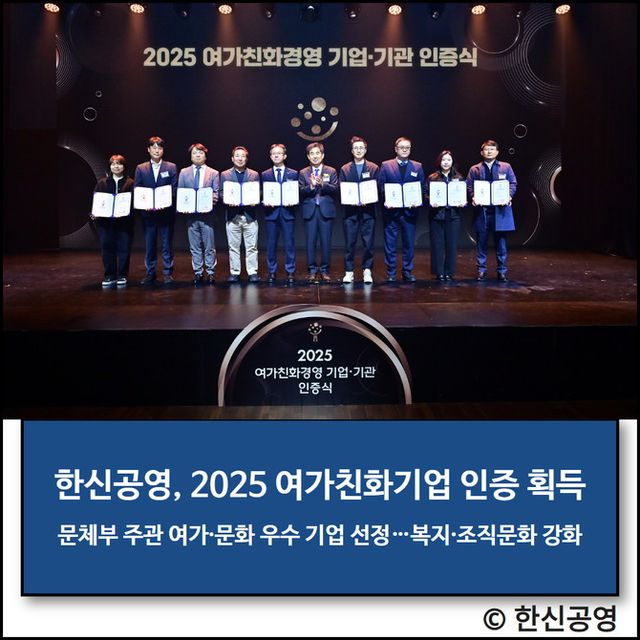 한신공영(004960)은 문화체육관광부가 인증하는 '2025년 여가친화기업'에 선정됐다고 7일 밝혔다. 여가친화기업 인증제는 근로자가 일과 여가를 균형 있게 유지할 수 있도록 제도적 환경을 조성한 기업을 대상으로 매년 부여된다.