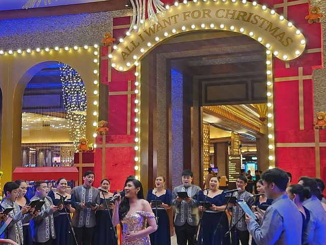 필리핀 가수이자 배우로 활동하고 있는 칼라 게바라 라포르테사와 합창단이 마닐라 베이에 위치한 솔레어 리조트에서 진행된 크리스마스 트리 점등식에서 공연을 하고 있는 모습. = 추민선 기자