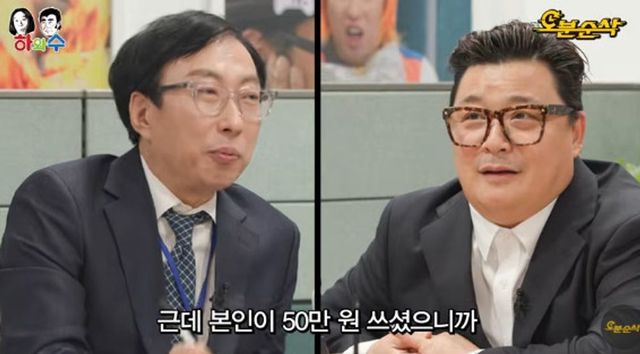 이어 박명수는 “좋은 일 있다면서요?”라며 53세에 늦깎이 신랑이 되는 윤정수의 결혼소식을 언급했다. 그러면서 “(저도 윤정수 씨도) KBS 라디오 하지 않나. 게시판에 ‘박명수 축의금 50만 원 기대’ 써놨는데 50이면 충분한가?”라고 물었다. 이에 윤정수는 “50이면 충분하죠”라고 강조했고 박명수는 “알겠다. 저는 솔직히 100만 원 하려고 했는데 본인이 50쓰셨으니까 50 하겠다”라고 말했다. 이에 윤정수는 깜짝 놀라며 “그렇게 많이 주려고?”라고 흡족해했다.