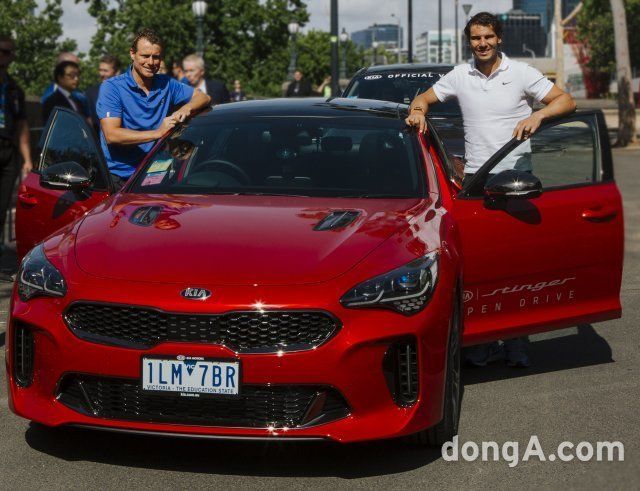 지난 2018년 호주오픈 대회 기간 기아차 스팅어와 기념사진을 촬영하고 있는 라파엘 나달. 동아일보DB