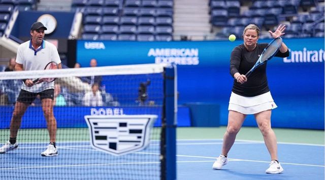 올해 US오픈 레전드 매치 이벤트에서 킴 클리에스터스(오른쪽)와 패트릭 래프터가 경기하는 모습. 네트에 캐딜락 로고가 보인다. US오픈 조직위 제공