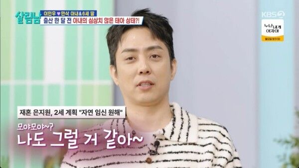 [메디먼트뉴스 김수현 기자] 가수 겸 방송인 은지원이 '살림남'에서 아빠 수업 중인 예비 아빠 이민우의 육아 일상에 깊은 공감을 표했다. 2세를 기다리고 있다고 밝힌 은지원은 6세 딸 등원 준비로 진땀을 흘리는 이민우를 보며 부모의 마음에 동조하는 모습을 보였다.