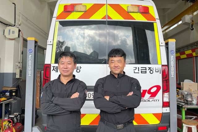 제주 소방장비 정비 교육센터에 최초로 임용됐던 나병문 소방장(왼쪽, 현 애월119센터장)과 진영범 소방장.