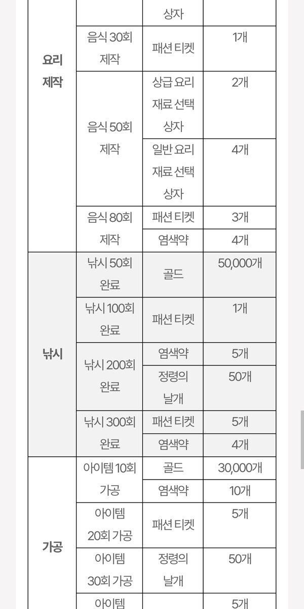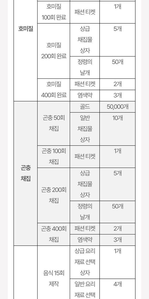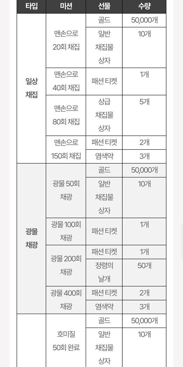보상 구성도 생활형 게임의 특성을 반영했다. 캐릭터 커스터마이징에 사용되는 패션 티켓과 염색약이 주요 보상이다. 맨손 채집 150회, 광물 채광 400회, 호미질 400회 등 최고 단계 미션을 완료하면 패션 티켓 2개와 염색약 3개를 획득할 수 있다. 낚시의 경우 300회 완료 시 패션 티켓 5개와 염색약 4개가 주어진다. 이 외에도 골드, 채집물 상자, 요리 재료 상자, 정령의 날개 등 실용적인 아이템들이 보상에 포함됐다.