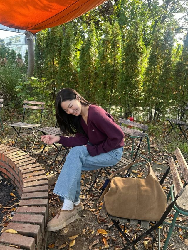 또 다른 사진에서는 야외 테라스에서 단풍이 내려앉은 벤치에 앉아 환하게 미소 짓고 있다. 내추럴한 청바지와 니트 차림, 그리고 캐주얼한 슈즈가 가을 감성을 완성했다.