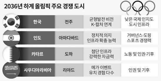 2036년 하계 올림픽 경쟁 도시로는 현재 아마다바드(인도) 도하(카타르) 리야드(사우디아라비아) 등이 거론된다. 전북도는 오는 12월까지 문화체육관광부에 개최 계획서를 제출, 관련 속도를 높일 예정이다. 전북도 관계자는 "(IOC 상황을 고려했을 때) 이르면 2027년, 늦으면 2029년 개최 도시가 선정될 것으로 보인다"라고 말했다.