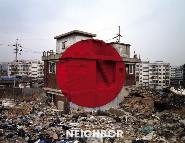 “2000년, 성곡미술관에서 열린 <동방의 빛>전을 준비하며 1998년, 처음 한국을 방문했습니다. 서울 한복판에서 철거를 앞둔 낡은 양옥집 외벽에, 사라질 공간을 기념하기 위해 붉은 원을 그렸습니다. 달빛과 태양빛을 상상하며 남긴 이 원은 어둠 속에서 빛을 상징하는 제 방식의 인사였습니다.”