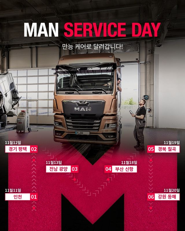 독일 프리미엄 상용차 브랜드 만트럭버스그룹(MAN Truck & Bus SE)의 한국법인 만트럭버스코리아(이하 ‘만트럭’)가 오는 11일부터 20일까지 ‘MAN 서비스데이’ 무상 점검 행사를 개최한다.