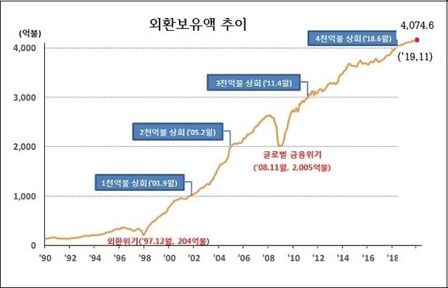 Imf 외환위기때와 글로벌 금융위기때 대응을 위해 일시적으로 급락한 이후에는 꾸준히 상향 추이임