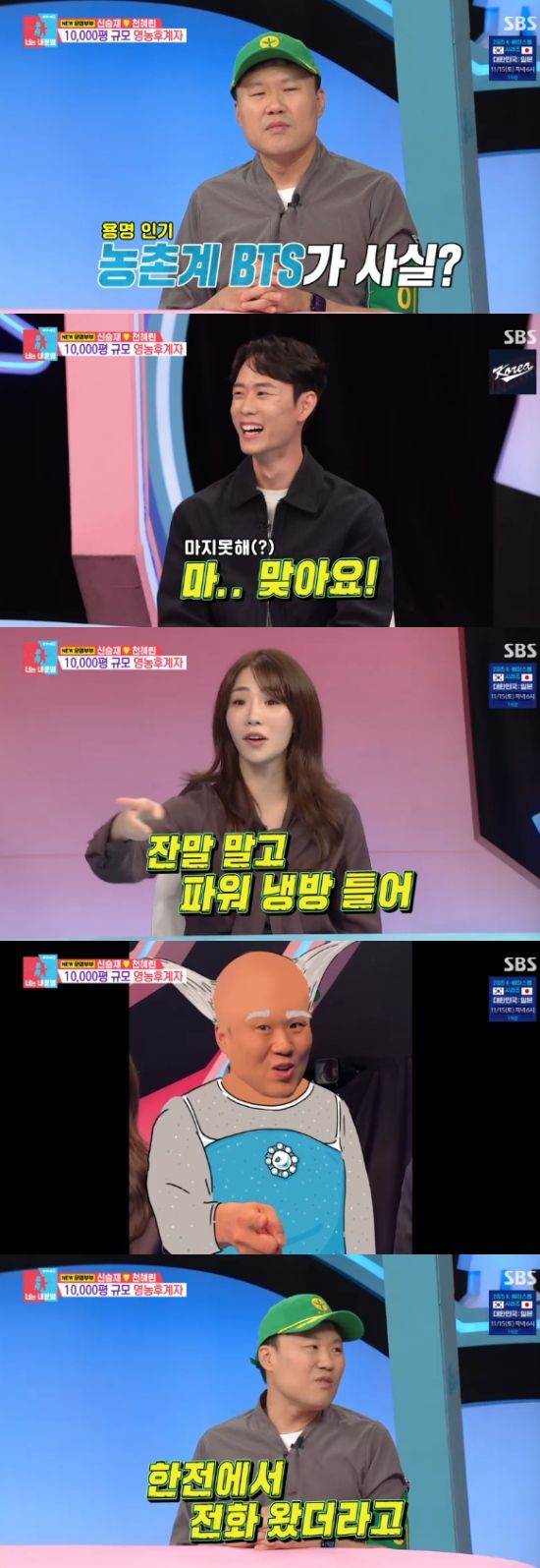 이날 스페셜 MC로 출연한 김용명은 "제가 농촌계 BTS"라면서 자랑했다. 이에 MC 김구라는 신승재와 천혜린에게 "진짜로 농촌에서 인기가 많느냐"고 물었다.