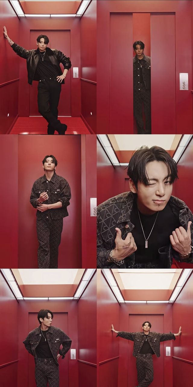 ‘어느 층으로 가셨나요? 정국이 엘리베이터에서 직접 보여드립니다’라는 제목의 영상 속에서 정국은 가죽 재킷과 블랙 팬츠로 완성한 올블랙 룩을 선보였다. 엘리베이터 문이 열리자 등장한 그는 시크한 눈빛과 절제된 제스처로 화면을 압도했다.