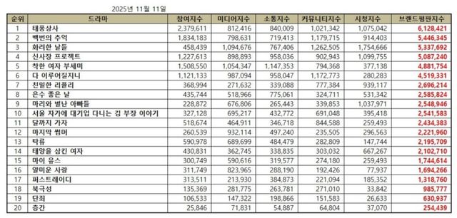 2025년 11월 드라마 브랜드평판 순위는 태풍상사, 백번의 추억, 화려한 날들, 신사장 프로젝트, 착한 여자 부세미, 다 이루어질지니, 친밀한 리플리, 은수 좋은 날, 마리와 별난 아빠들, 서울 자가에 대기업 다니는 김 부장 이야기, 달까지 가자, 마지막 썸머, 탁류, 태양을 삼킨 여자, 마이 유스, 얄미운 사랑, 퍼스트레이디, 북극성, 단죄, 층간 순으로 분석됐다.
