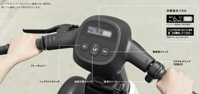 또한, 회전식 그립 액셀과 핸들 레버 브레이크로 이륜차처럼 쉽게 운전할 수 있다. 중앙 디스플레이에는 속도와 배터리 잔량이 표시되며, 시트는 암레스트 일체형으로 편안한 착좌감을 제공한다.