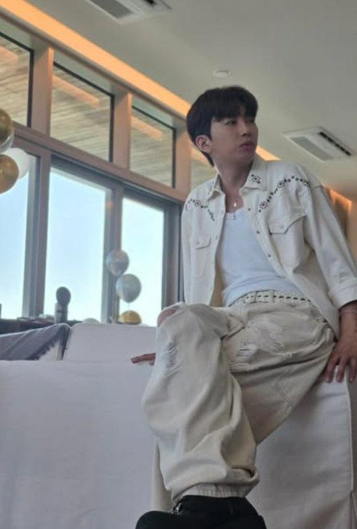 이어 다른 사진에서는 밝은 베이지 톤의 루즈핏 셔츠와 와이드 팬츠를 매치하고 한쪽 다리를 올린 채 시크한 포즈를 취하고 있다. 자유분방하면서도 스타일리시한 그의 모습은 패셔니스타로서의 면모를 다시 한번 입증한다.