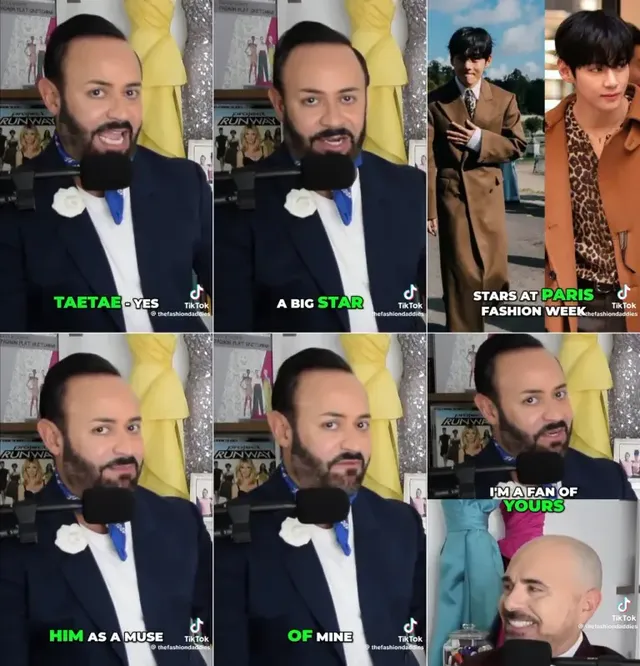 세계적인 패션 디자이너 닉 베레오스는 최근 파리 패션 위크에서 뷔를 보고 팬이 되었다고 밝히며, 그를 '태태'와 '태형'으로 지칭하며 자신의 새로운 뮤즈로 언급했다. 그는 인기 리얼리티 프로그램 '프로젝트 런웨이' 시즌 2에 참가해 이름을 알렸으며, 비욘세, 케이티 페리 등 다수의 할리우드 스타 의상을 담당해 온 베테랑 디자이너이자 서부 패션디자인 스쿨 FIDM의 디자인 학장으로 활동하고 있다.