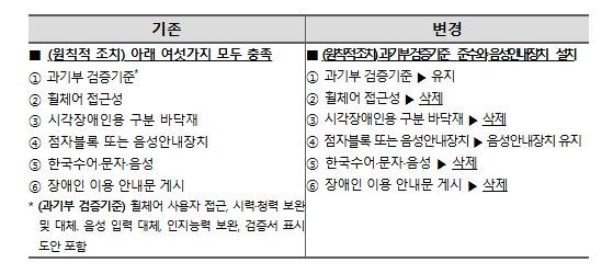첫째, 기존에는 공공 및 민간의 무인정보단말기 설치 현장에서 과학기술정보통신부 검증기준을 준수한 무인정보단말기*, 휠체어 접근성 등 여섯가지 편의 제공 방식을 모두 충족해야 하나, 시행령 개정으로 과학기술정보통신부의 검증기준을 준수한 무인정보단말기와 무인정보단말기의 위치를 음성으로 안내하는 음성안내장치를 설치하면 된다.