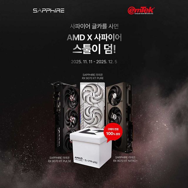 이엠텍아이엔씨가 11월 11일부터 12월 7일까지 SAPPHIRE 그래픽카드 구매 고객을 대상으로 ‘AMD X SAPPHIRE 콜라보레이션 게이밍 스툴’을 증정하는 프로모션을 진행한다. 행사 대상은 SAPPHIRE 라데온 RX 9070 XT, RX 9070, RX 9060 XT, RX 9060 등 전 라인업이며, 단품 그래픽카드뿐 아니라 탑재 PC 제품도 포함된다. 한정 수량으로 진행되며, AMD 리뷰 이벤트 참여 시 네이버페이 15,000원 추가 혜택이 제공된다.