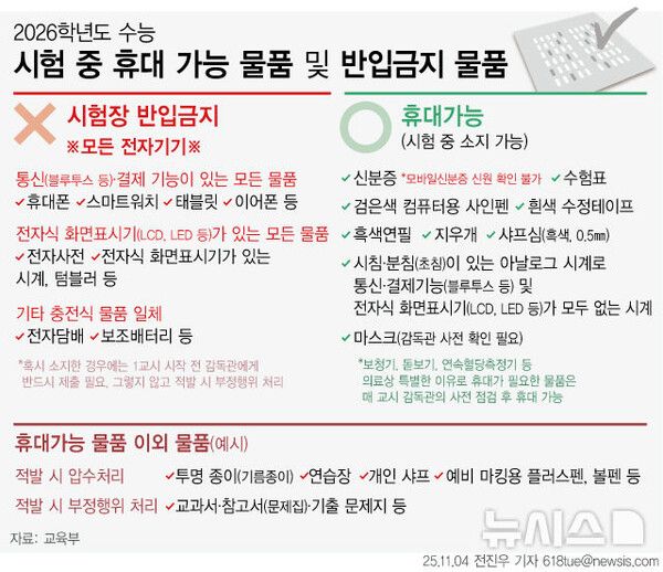2026학년도 대학수학능력시험(수능·11월 13일) 수험생은 예비 소집에 참석해 수험표를 수령하고 시험 유의 사항을 전달 받아야 한다. 시험 당일에는 수험표와 사진이 부착된 유효기간 내의 신분증을 지참해야 하며, 모바일 신분증은 불가하다. 휴대전화·전자담배 등 모든 전자기기는 시험장에 반입할 수 없다. 1교시 시작 전까지 제출하지 않으면 부정행위로 시험 자체가 무효 처리 되므로 주의해야 한다.