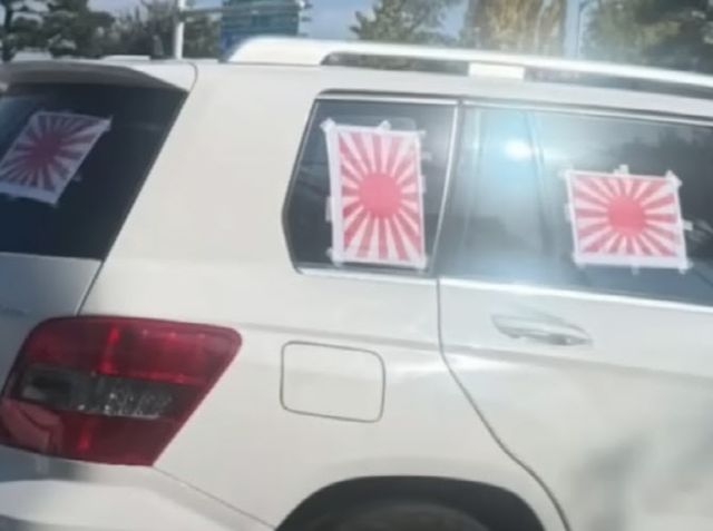 이번 주 온라인 커뮤니티, SNS 등에는 해당 차량 사진이 올라와 빠르게 퍼졌다. 이 차량은 오른쪽 측면, 뒷유리 등 차체 여러 곳에 욱일기를 붙인 채 대구 북구 일대를 주행했던 것으로 알려졌다.