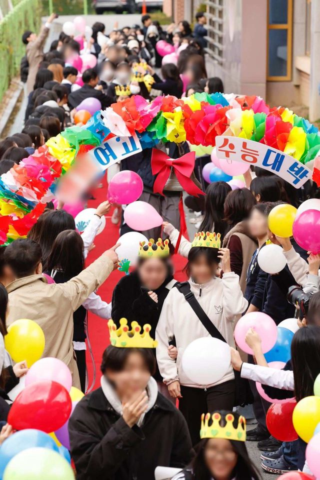 2026학년도 대학수학능력시험을 하루 앞둔 12일 광주 남구의 한 여고에서 3학년 수험생들이 후배들과 선생님의 응원을 받으며 교정을 나서고 있다. / 뉴스1