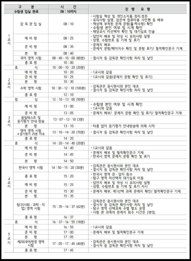 이번에 수능을 치르는 일반 수험생 시험은 오전 8시 10분까지 모든 수험생이 입실을 완료해야 시작된다. 1교시는 국어 영역으로, 오전 8시 40분에 시작해 10시까지 80분간 치러진다. 시험 전에는 감독관이 유의사항을 안내하고, 수험생은 답안지에 성명과 수험번호를 기재한 뒤 문제지 문형과 페이지 수를 확인하고 필적확인문구를 적는다. 시험이 끝난 뒤에는 20분간 휴식 시간이 주어진다.