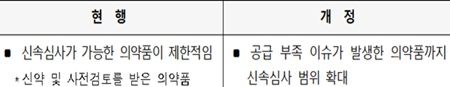 코로나19 상황 등에서 발생할 수 있는 공급부족 위기 시 우선적으로 심사할 수 있는 대상을 ‘공급 부족 발생 의약품 등 식약처장이 필요하다고 판단하는 의약품’까지 추가·확대하여 환자 치료·예방 기회를 확보하기 위해 추진됐다.