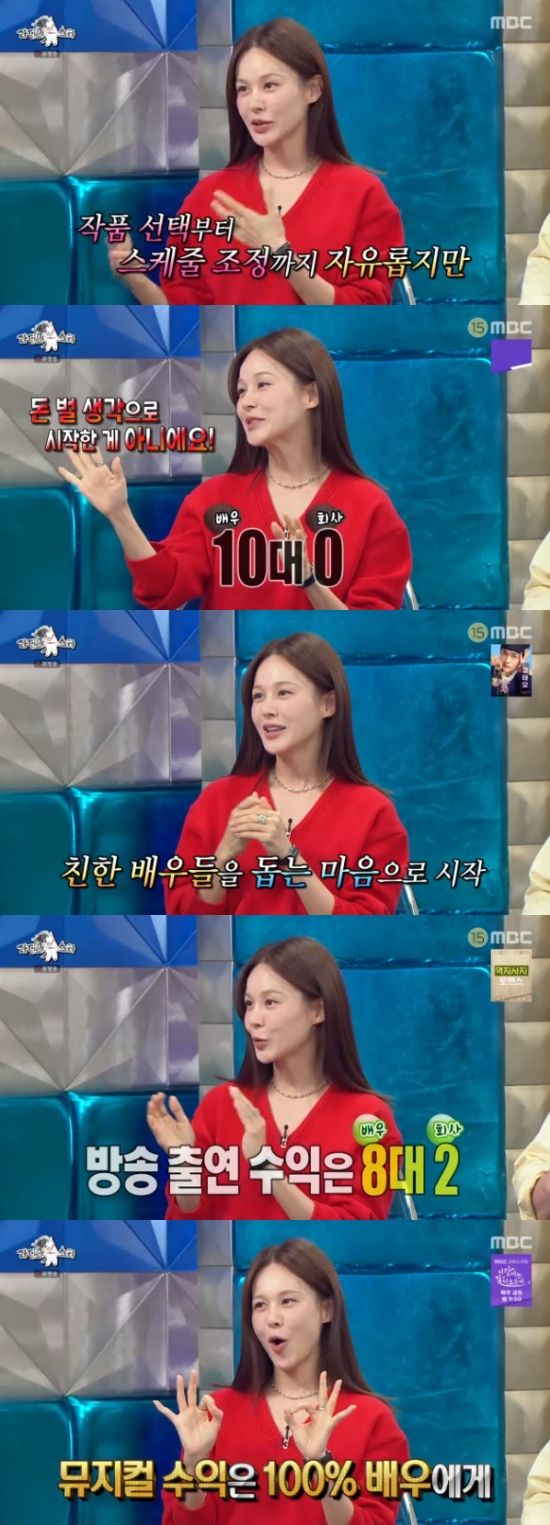 아이비는 "소속 배우도 2명이 있다. 소속 배우들과 비율은 10대 0이다. 돈 벌려고 하는게 아니다. 촬영할 때 차량 제공도 해준다. 뮤지컬은 10대 0이고, 방송 수입은 8대 2정도로 나눈다"고 말해 눈길을 끌었다.