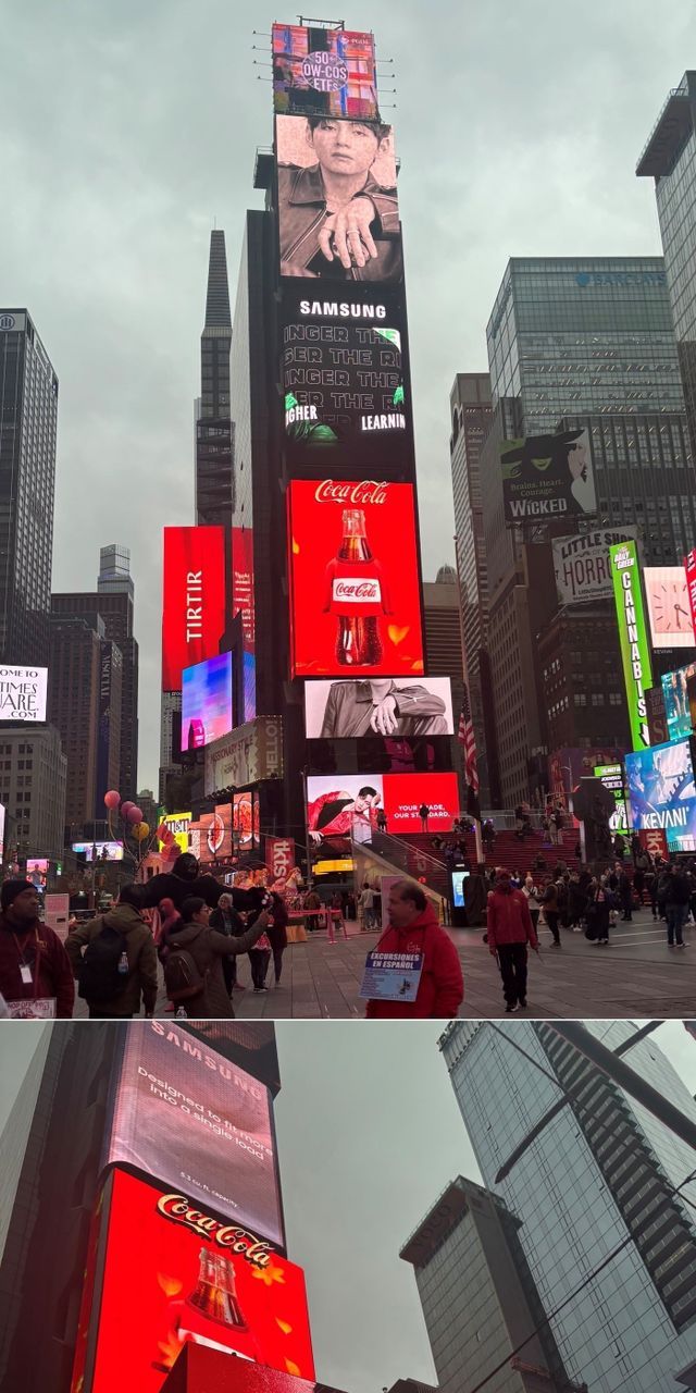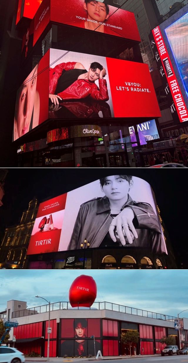뉴욕 타임스 스퀘어의 상징인 원 타임스 스퀘어(One Times Square) 빌딩에서는 총 10개의 대형 스크린 중 7개가 뷔의 티르티르 광고 영상으로 채워졌다. 여기에 인근 대형 광고판 4곳에서도 뷔의 영상이 송출되며, 타임스 스퀘어 일대가 ‘뷔 존(V Zone)’으로 변했다. 이곳은 매년 새해를 알리는 볼 드롭 행사가 열리는 글로벌 랜드마크로, 삼성 등 세계적인 기업들이 경쟁적으로 광고를 내는 자리다.