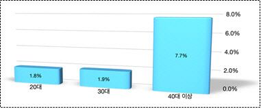 합병증 발생에서도 유의미한 차이를 보였다. 대상군 831명 중 22명(2.6%)이 합병증을 보였다. 20대 10명(1.8%), 30대 3명(1.9%)에 비해 40대 이상은 9명(7.7%)로 가장 높았다.