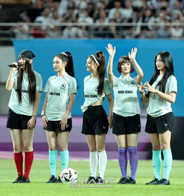 잉글랜드 프리미어리그(EPL) 토트넘 홋스퍼와 독일 분데스리가 바이에른 뮌헨의 2024쿠팡플레이시리즈 2차전이 3일 오후 서울 마포구 서울월드컵경기장에서 열렸다. 경기 전 그룹 뉴진스가 시축을 위해 그라운드에 나와 인사를 하고 있다. 상암=김민규 기자 mgkim1@edaily.co.kr /2024.08.03/