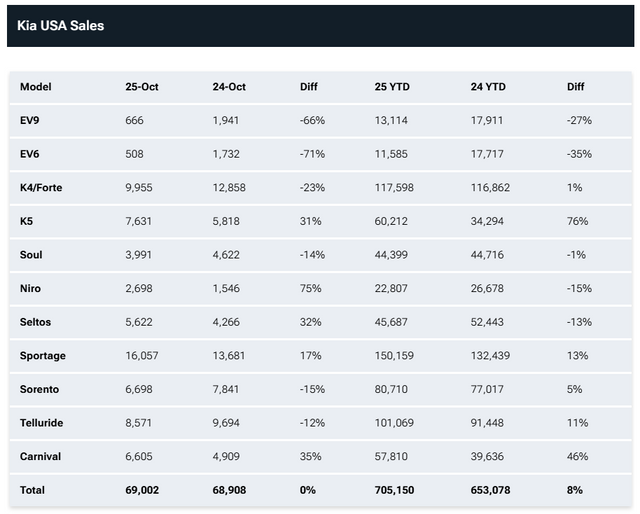 기아 역시 비슷한 흐름을 보였다. 기아의 누적 판매량은 705,150대로, 지난해 같은 기간(653,078대)보다 8% 증가했다. 10월 한 달 판매도 68,908대에서 69,002대로 소폭 상승했다. 그러나 전기차 부문에서는 큰 폭의 하락세를 면치 못했다.