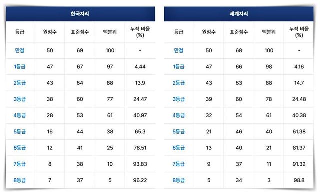 2025학년도 수능 '한국지리' '세계지리' 등급컷(2024.11.14 수능) / 메가스터디