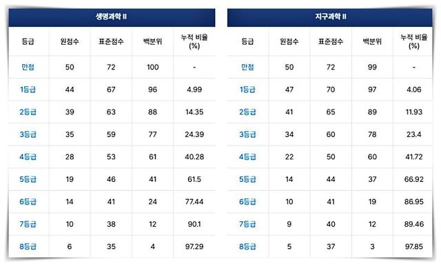 2025학년도 수능 '생명과학2' '지구과학2' 등급컷(2024.11.14 수능) / 메가스터디