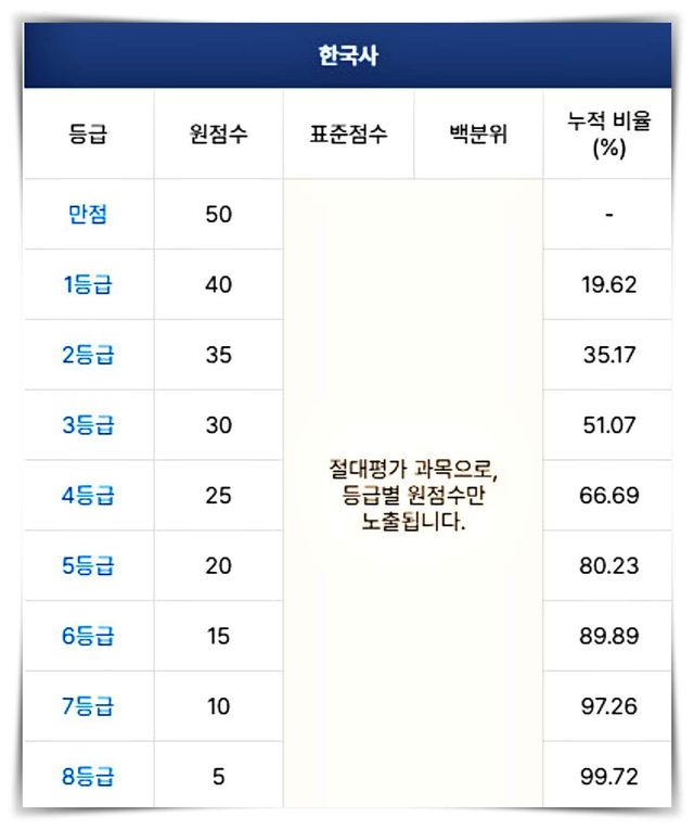 영어·한국사·제2외국어·한문은 절대평가 영역으로, 등급만 표기되며 원점수나 표준점수는 반영되지 않는다.