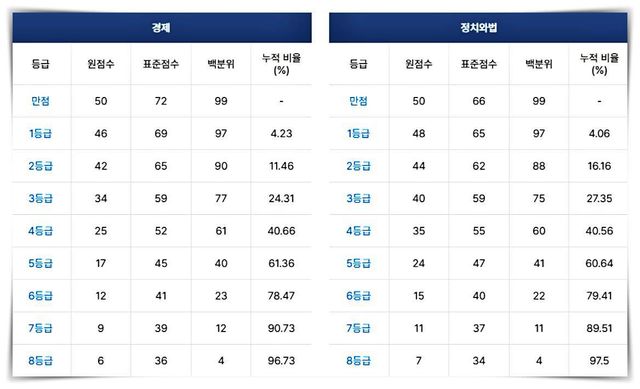 2025학년도 수능 '경제' '정치와법' 등급컷(2024.11.14 수능) / 메가스터디