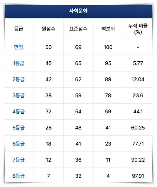 2025학년도 수능 '사회문화' 등급컷(2024.11.14 수능) / 메가스터디