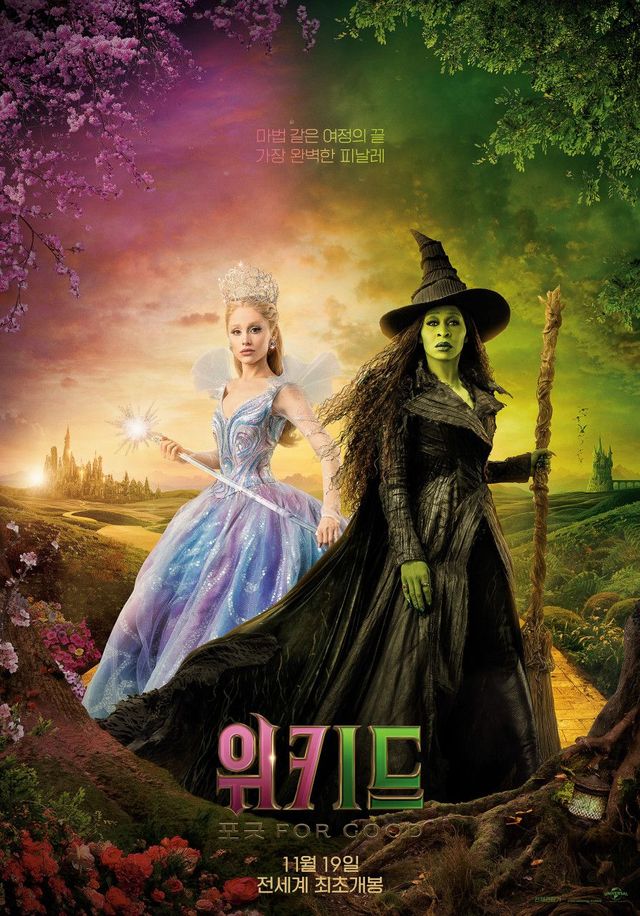 드디어 1년의 인터미션이 끝났다. 뮤지컬 〈위키드〉를 원작으로 한 영화 〈위키드: 포 굿〉이 11월 19일에 개봉한다. 지난해 개봉한 파트 1에 이어, 다른 길을 선택할 수밖에 없었던 사악한 마녀 ‘엘파바’와 착한 마녀 ‘글린다’가 진정한 우정을 찾아가는 이야기를 이어간다. 이번 파트 2의 관람 포인트는 파트 1과 마찬가지로 다채로운 볼거리에 있다. 신시아 에리보와 아리아나 그란데가 부르는 뮤지컬 넘버와 화려한 세트를 감상하다 보면 137분의 러닝타임이 금새 지나 있을 것이다.