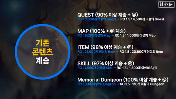 마지막으로 소개된 ‘라그나로크 온라인 프로젝트 1.5’는 기존 ‘라그나로크 온라인’의 세상을 ‘거울 차원’과 함께 대폭 확장하고 나서는 프로젝트다. 신작의 ‘거울 차원’은 기존 원작 세계관과 달리 다크 판타지 요소가 강조된 세상으로, 게임 내에서 이용자들은 원작 차원 혹은 거울 차원 중 하나를 선택해 게임을 즐길 수 있다.