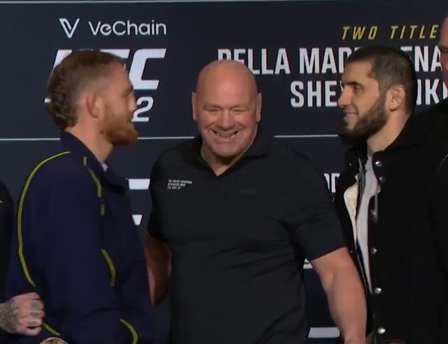 무대에 오른 두 선수는 처음엔 밀치기나 신체 접촉 없이 팽팽한 눈싸움으로 시작했지만 사진 촬영을 위해 데이나 화이트 대표가 자리를 비키자 상황이 달라졌다.