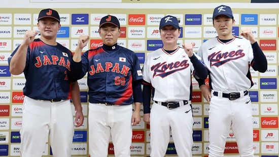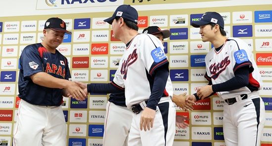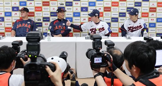 한국 류지현 감독과 일본 이바타 히로카즈 감독, 그리고 한국 주장 박해민과 일본 주장 마키 슈고가 14일 일본 도쿄돔 한일전 공식 기자회견에 참석했다.