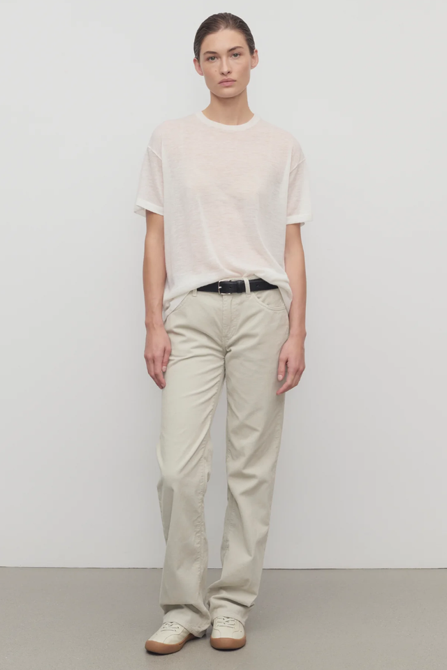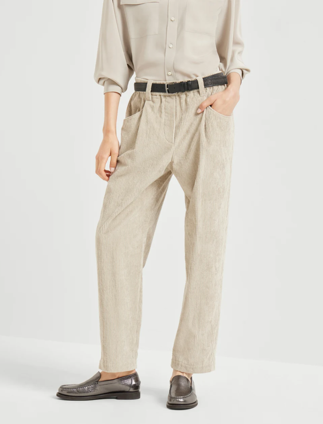 코듀로이 소재의 팬츠를 선택할 때는 색감은 물론, 소재의 두께감에서 오는 핏을 살피는 것이 중요하다. 옅은 베이지 컬러에 가까운 아이보리 컬러의 브루넬로 쿠치넬리 코듀로이 배기 트라우저 팬츠는 배기 팬츠 핏을 포멀한 핏으로 살려 어떤 스타일도 무난하게 소화할 수 있게 했다. 더 로우 코듀로이는 소재가 지나치게 두껍지 않고 편안하게 떨어지는 스트레이트 핏으로 데일리 룩에서 고민 없이 선택할 수 있다.