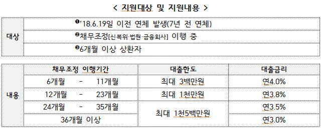 대출 금리는 은행권 신용대출 수준인 연 3~4% 수준이며, 1인당 대출 한도는 최대 1500만원입니다. 채무 조정 이행 기간이 길수록 금리는 낮아지고, 한도는 높아집니다. 예컨대 6~11개월이라면 대출 한도는 최대 300만원, 이자율은 연 4%지만 24~35개월이면 대출 한도는 1500만원, 이자율은 연 3.5%가 적용됩니다.