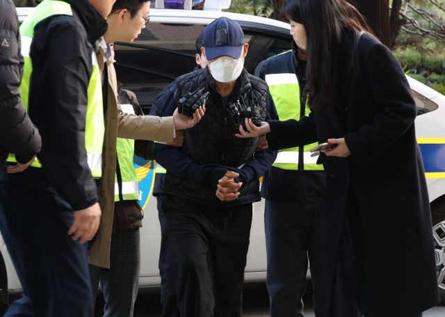 A씨는 수갑이 채워진 두 손을 가리개로 덮고 모자와 마스크로 얼굴을 가렸다.