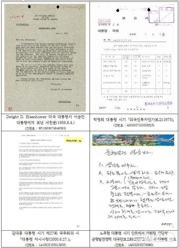이번에 공개되는 주요 대통령기록물은 대통령 외교서한, 각 대통령별 주요 정책을 담고 있는 보고 및 회의 자료 등이다.