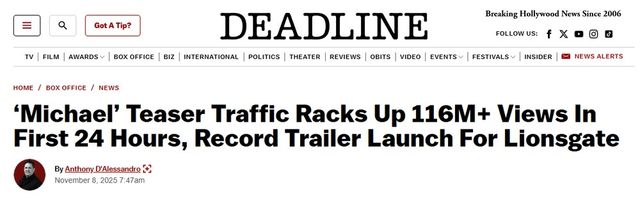 외신 ‘데드라인'(DEADLINE)에 따르면, ‘마이클’의 티저 예고편은 공개와 동시에 단 24시간 만에 1억 1,620만 조회수를 기록했다. 이는 ‘보헤미안 랩소디'(5,760만 회)를 비롯한 음악 전기 영화는 물론 ‘Taylor Swift | The Eras Tour’(9,610만 회)와 같은 콘서트 필름까지 포함해 음악 영화를 통틀어 가장 높은 조회수다.