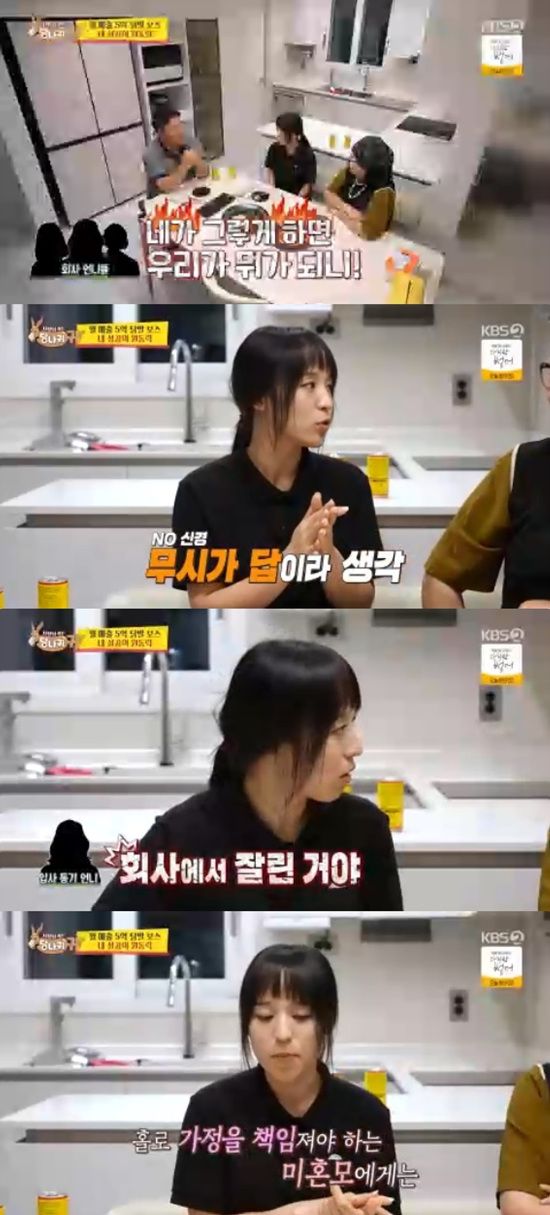 김량진은 회사 언니들이 자신을 향해 "적당히 하라. 네가 그렇게 하면 우리가 뭐가 되느냐"고 말했다고 털어놨다. 따돌림까지 당했다고.