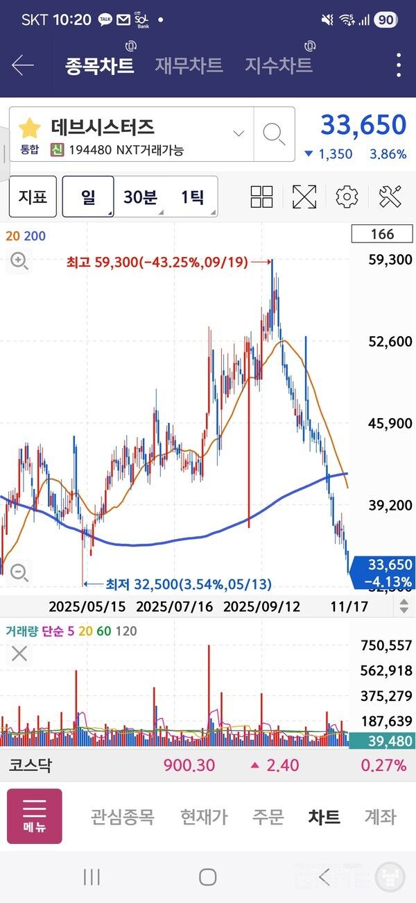2024년 화려한 흑자 전환에 성공했던 데브시스터즈가 2025년 3분기 적자로 돌아서며 주가마저 급락하고 있다. 한때 5만 9,300원까지 치솟았던 주가는 현재 3만 3,650원으로 43.25% 폭락했다. 무슨 일이 있었던 걸까.