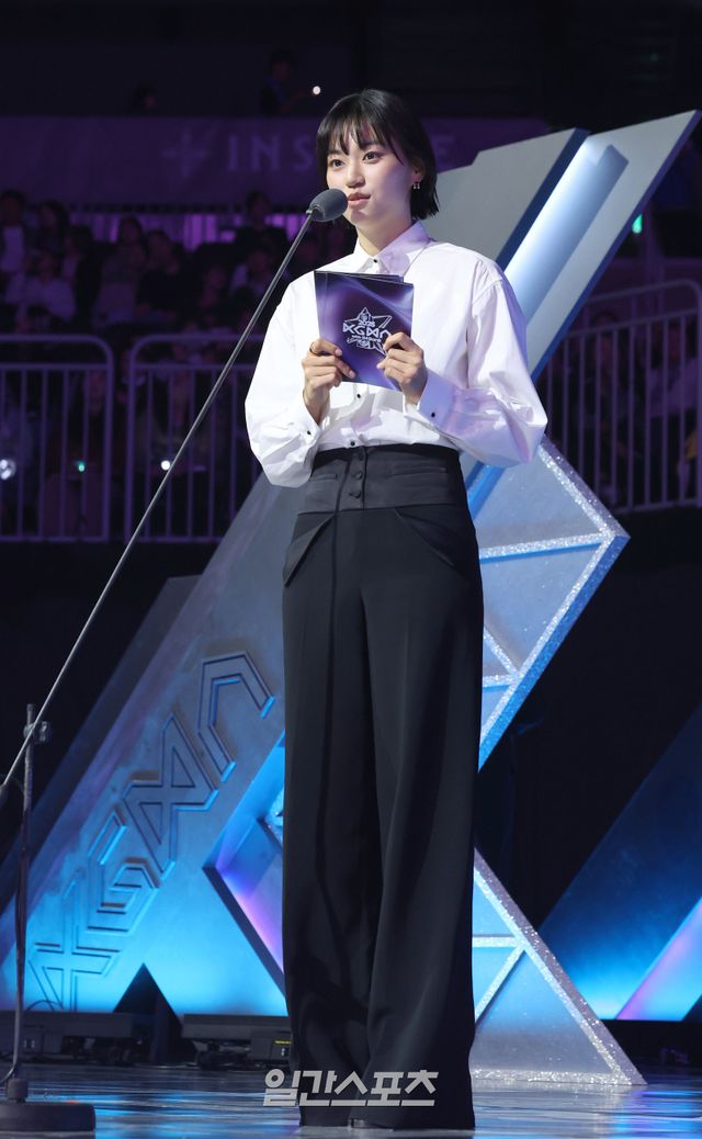 여기에 턱시도 칼라 셔츠와 짧은 단발 헤어스타일, 무심한 듯 주머니에 손을 넣은 포즈가 더해져 중성적이면서도 강렬한 카리스마를 발산했다. 매니시 룩을 완벽하게 소화한 김도연의 모델급 피지컬과 시크한 비주얼은 시상식 현장을 압도했다.
