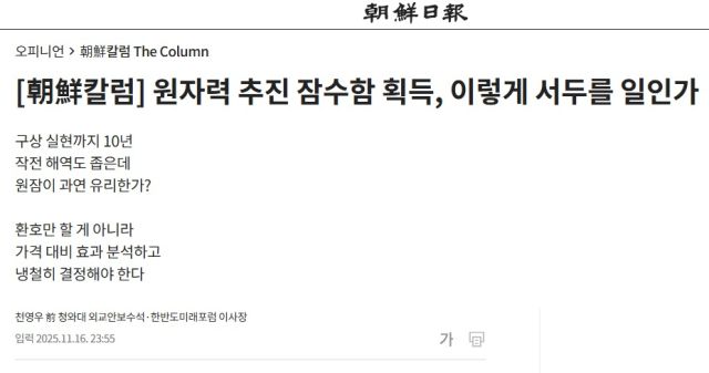 17일자 <조선일보>에는 "[朝鮮칼럼] 원자력 추진 잠수함 획득, 이렇게 서두를 일인가"라는 제목의 천영우 전 청와대 외교안보수석의 글이 실렸다. 천 전 수석은 보수 성향 인사로 이명박 정부에서 외교안보수석을 지낸 인물이다.