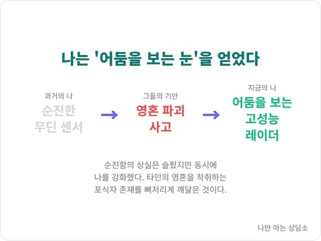 당신이 얻은 가장 큰 소득은, 아이러니하게도 ‘순진함의 상실’ 이다. 세상에는 이유 없이 악한 존재가 있다는 것, 인간의 탈을 쓰고 타인의 영혼을 착취하는 포식자가 존재한다는 사실을 뼈저리게 깨달았다. 이것은 슬픈 일이지만, 동시에 엄청난 능력이다.
